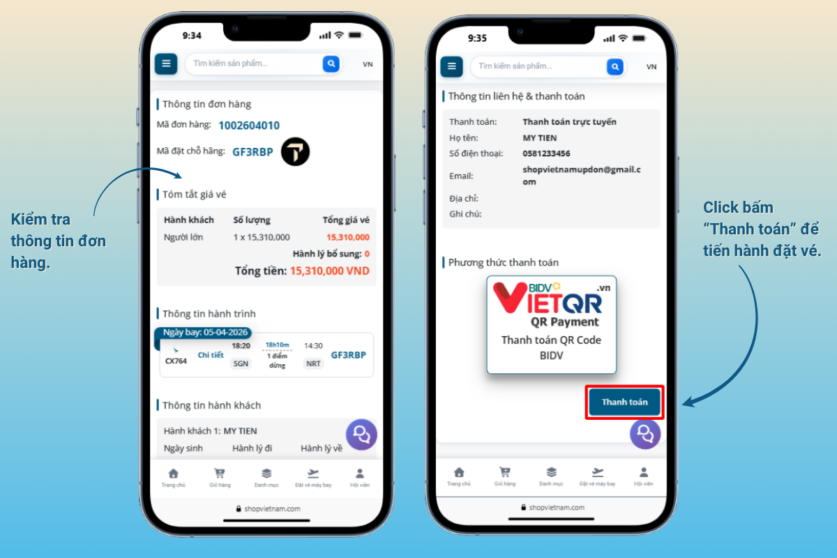 Lưu ý: Quý khách vui lòng lưu lại Email xác nhận và Mã đặt chỗ để thuận tiện cho việc làm thủ tục tại sân bay hoặc liên hệ hỗ trợ, khiếu nại (nếu có).