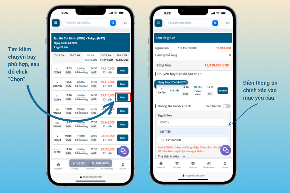 Bước 3: Lựa chọn chuyến bay và điền thông tin