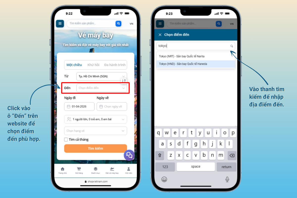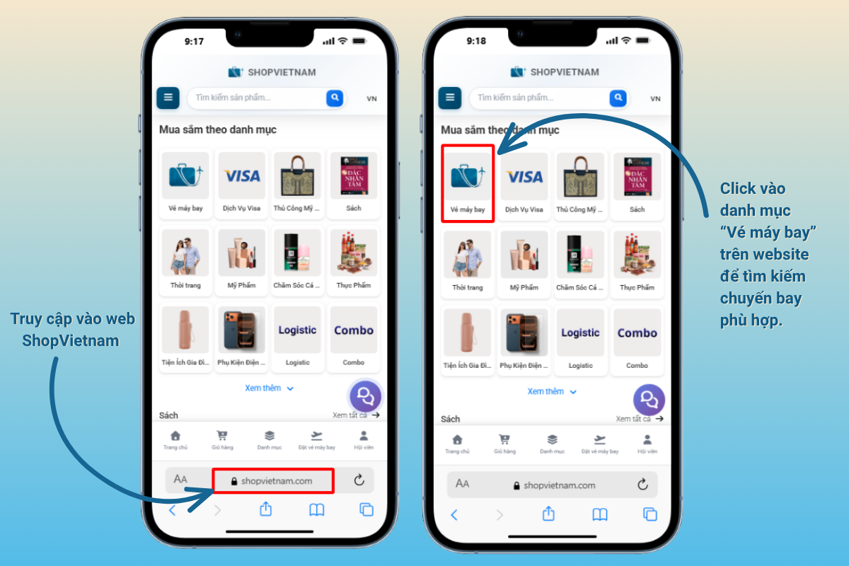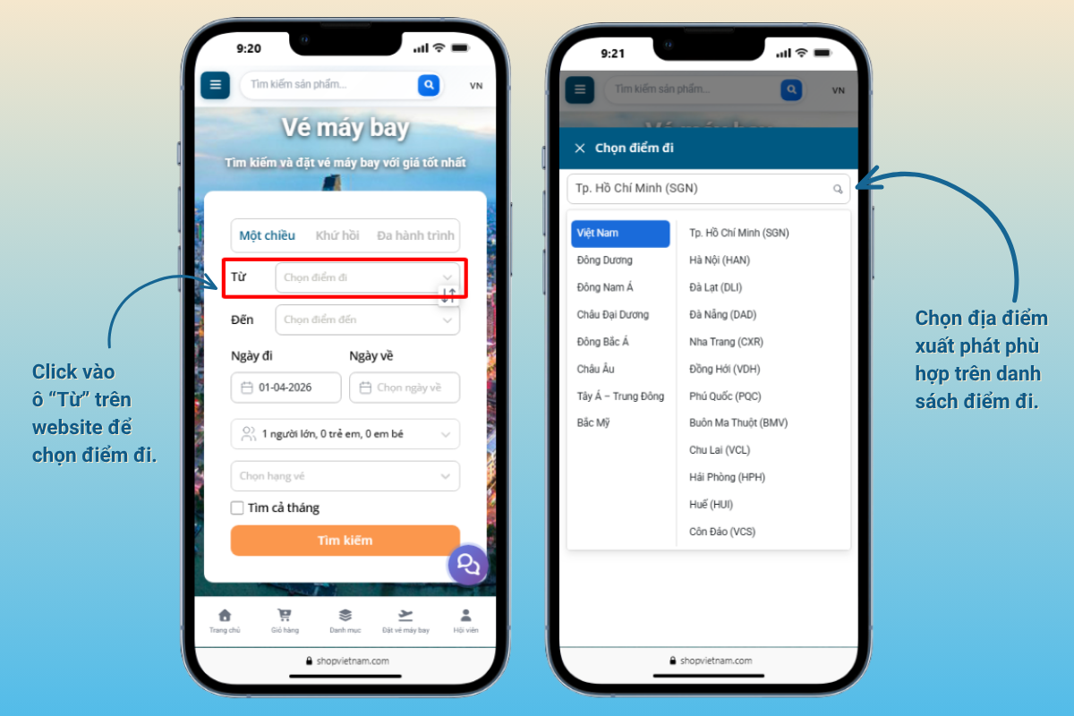 Chào mừng Quý khách đến với dịch vụ đặt vé máy bay trực tuyến của ShopVietnam.com. Với giao diện thân thiện và tích hợp thông minh, Quý khách có thể dễ dàng tìm kiếm và sở hữu những tấm vé máy bay giá tốt nhất cho hành trình di chuyển toàn cầu.