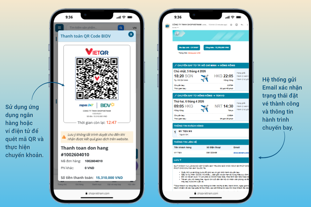 - Gửi email hoặc SMS xác nhận trạng thái đặt vé thành công và chi tiết hành trình bay.