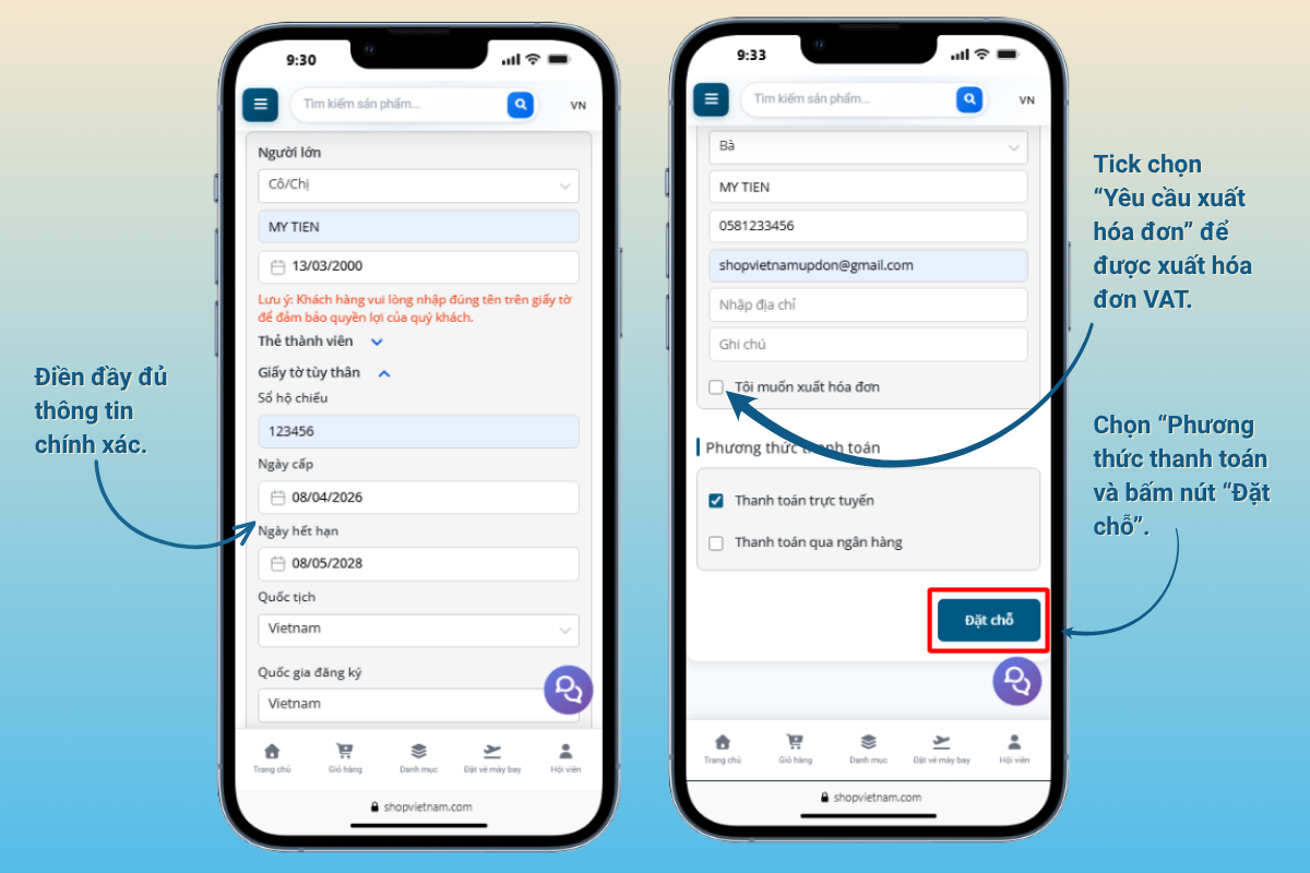- Yêu cầu đặc biệt: Nếu cần xuất hóa đơn VAT, Quý khách vui lòng tick chọn “Yêu cầu xuất hóa đơn” và điền đầy đủ mã số thuế, tên công ty.